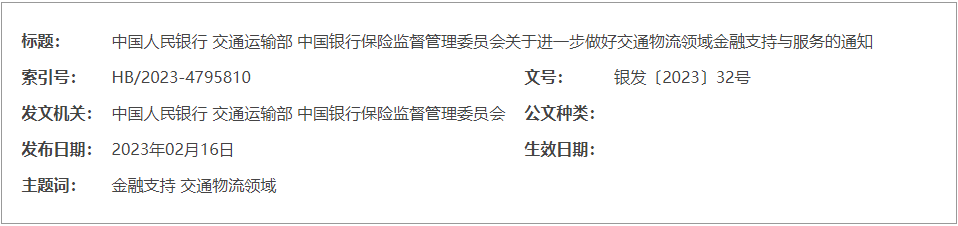为深入贯彻党的二十大和中央经济工作会议精神,发挥各方合力,助力交通物流业高质量发展和交通强国建设,现就进一步做好交通物流领域金融支持与服务有关事宜通知如下: