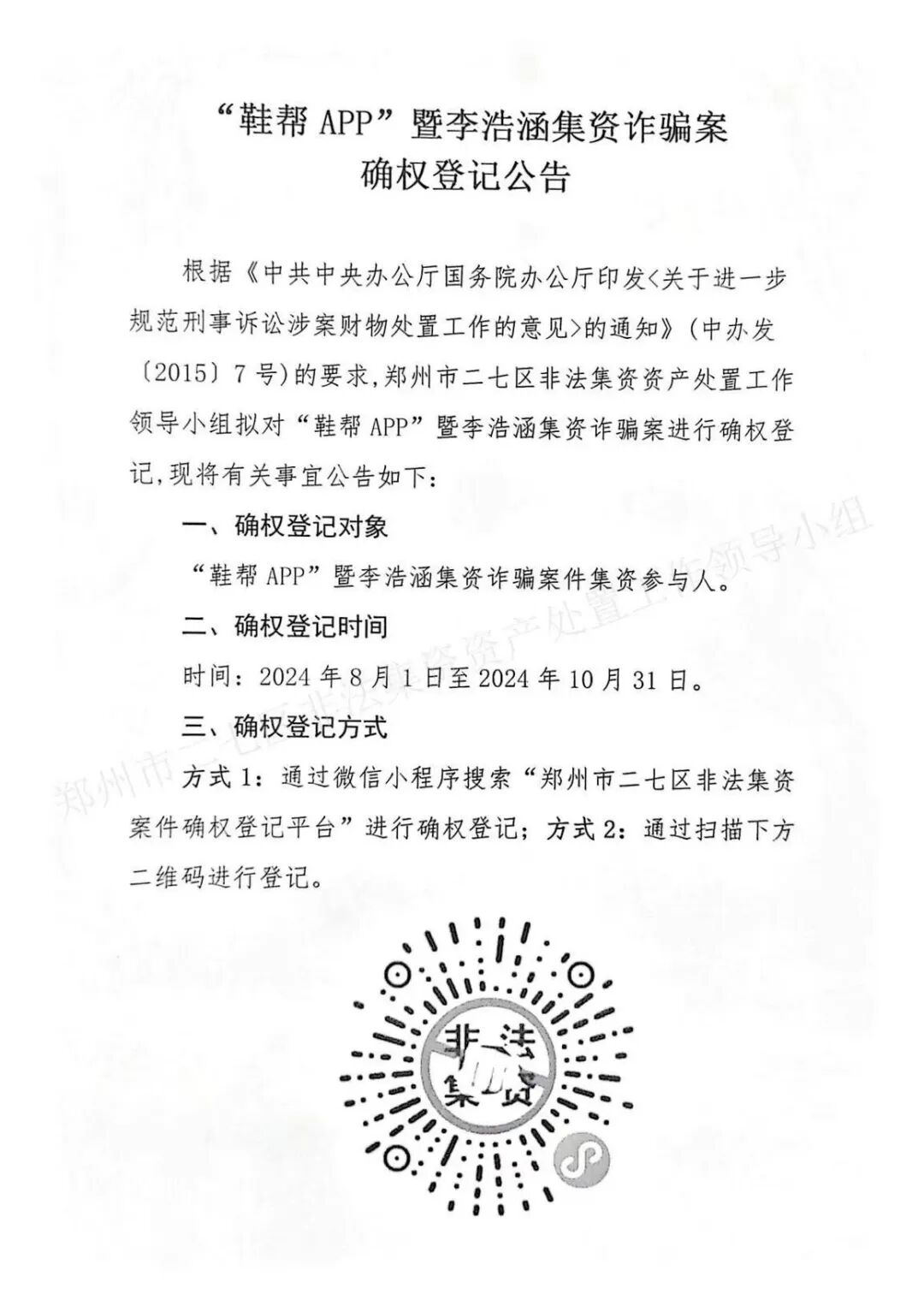“鞋帮APP”暨李浩涵集资诈骗案确权登记公告