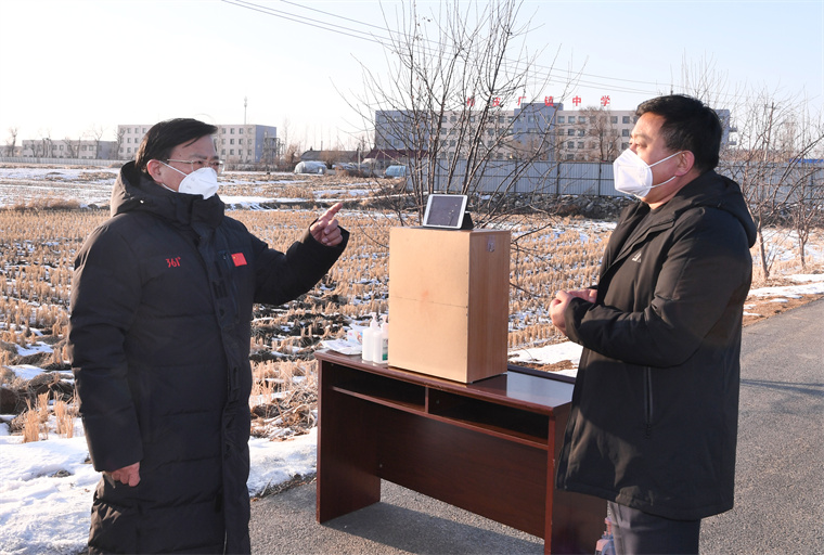 3月19日,韩俊在吉林市昌邑区桦皮厂镇疫情防控卡点实地检查高风险区疫情管控工作。宋锴 摄