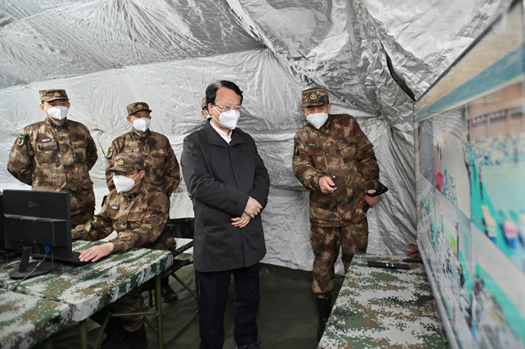 4月7日,省委书记景俊海到长春市九台区实地检查指导疫情防控工作,在行知学校方舱医院和军队医疗队驻地,看望慰问前来支援的军队医务人员。邹乃硕 摄