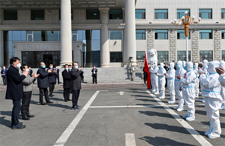 4月14日,省委书记景俊海到长春市实地检查指导疫情防控、复工复产等工作,为圆满完成包保支援任务的通化工作队送行。邹乃硕 摄