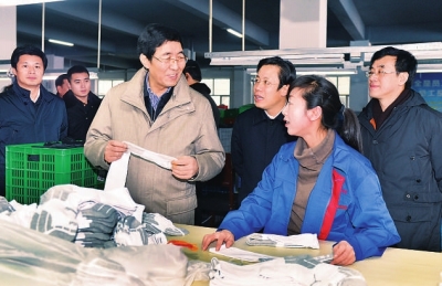 这是他在东北袜业纺织工业园与生产车间工人亲切交谈。栾雅丽摄