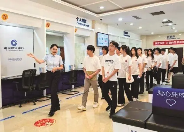 长春工业大学师生参观建行西安大路支行营业网点,感受金融服务的便捷与高效。