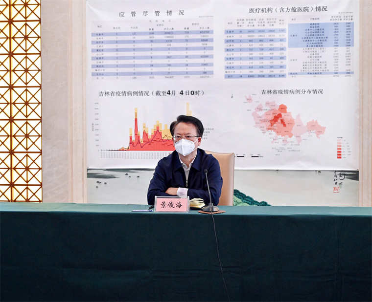 4月4日,省委书记景俊海主持召开视频会议,调度部署长春市九台区疫情防控工作。他强调,要深入贯彻习近平总书记关于疫情防控的重要讲话重要指示精神,按照孙春兰副总理部署要求,坚定不移贯彻“动态清零”总方针,继续坚持快、准、严、实、细,巩固拓展九台疫情防控成果,奋力夺取长春保卫战全面胜利。