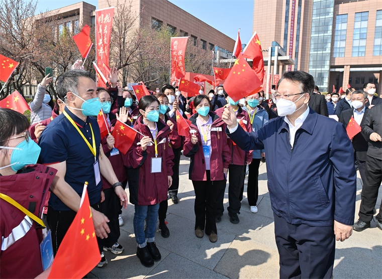 4月29日,省委书记景俊海在长春市为圆满完成任务、即将胜利凯旋的陕西、湖北、山西、河南、辽宁五省援吉医疗队送行。邹乃硕 摄