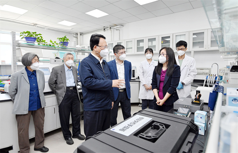 5月23日,省委书记景俊海在长春市就核酸检测技术创新、试剂生产以及疫苗研发生产等工作进行调研,在中科院长春应化所电分析化学国家重点实验室实地察看科研团队研发的检测装置。邹乃硕 摄