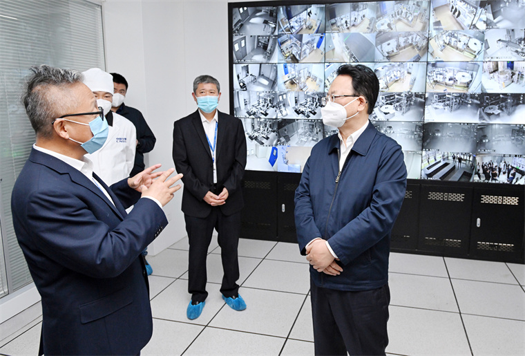 5月23日,省委书记景俊海在长春市就核酸检测技术创新、试剂生产以及疫苗研发生产等工作进行调研,在长春生物制品研究所有限责任公司越达厂区通过视频了解生物安全实验室和生物安全车间建设运行情况。邹乃硕 摄