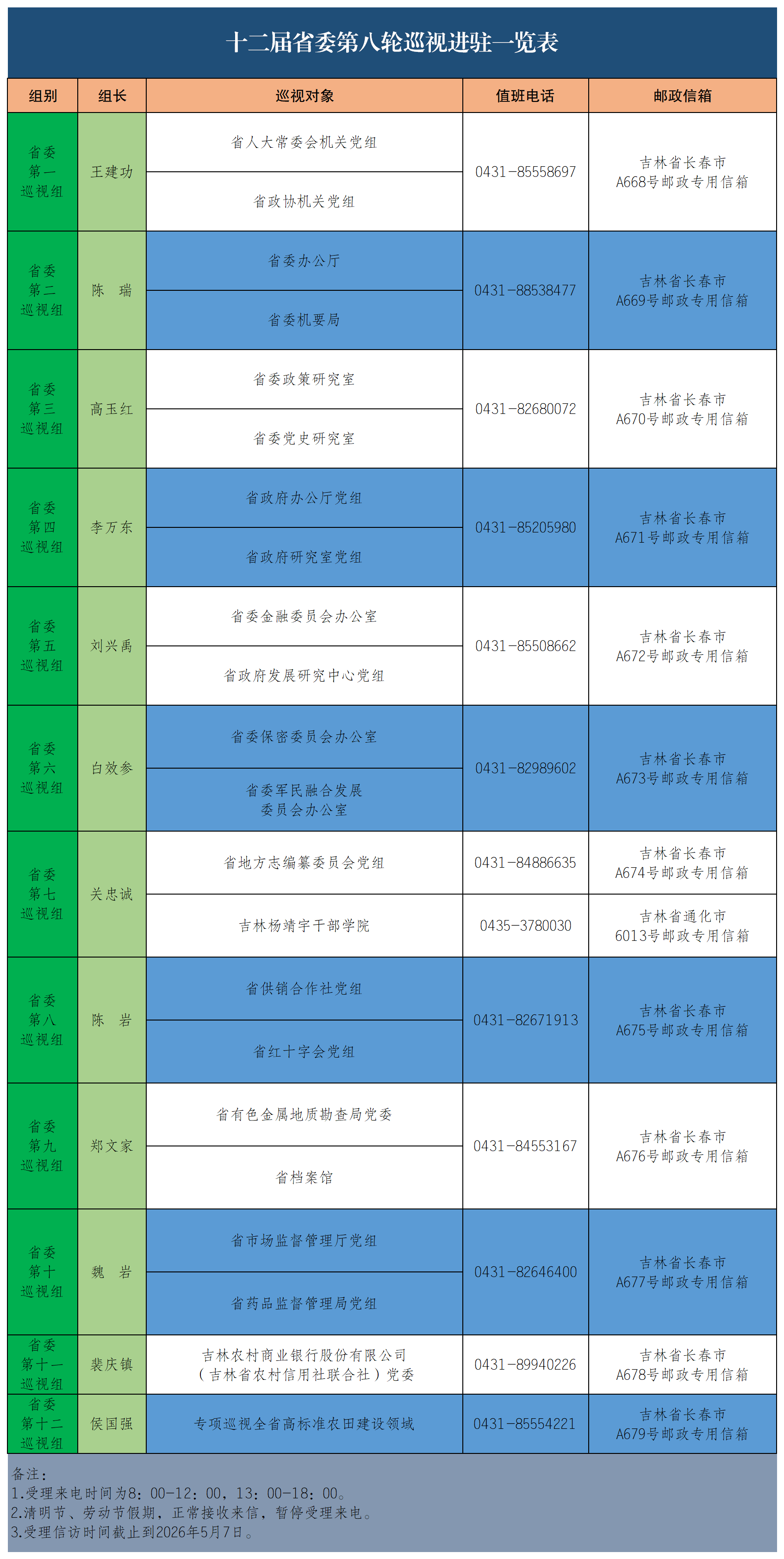据悉,各省委巡视组现场巡视2个月左右,巡视期间设立专门值班电话和邮政信箱,主要受理反映被巡视党组织领导班子及其成员、下一级党组织主要负责人和重点岗位人员问题的来信来电,重点是关于违反政治纪律、组织纪律、廉洁纪律、群众纪律、工作纪律、生活纪律等方面的举报和反映。巡视组受理信访时间截止到2026年5月7日。